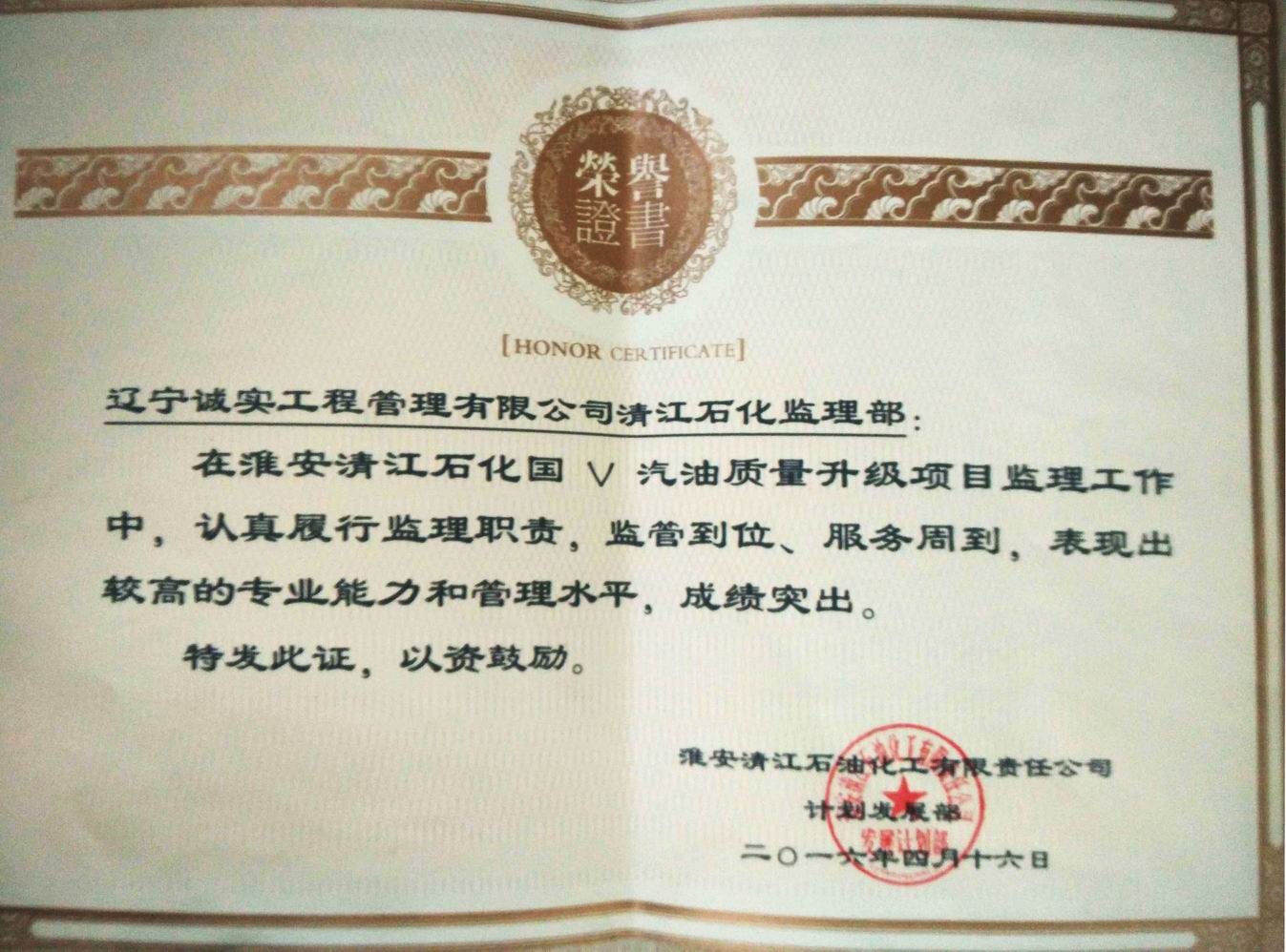 2016年淮安清江石化國V汽油質(zhì)量升級項目獎狀