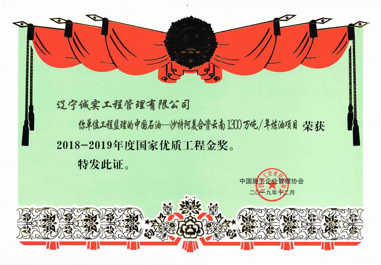 2019年12月,我單位所監理的“煙臺萬華搬遷MDI一體化項目氯堿裝置區”被評為2018-2019年度國家優質工程獎、“中國石油-沙特阿美合資云南1300萬噸/年煉油項目”被評為2018-2019年度國家優質工程金獎。