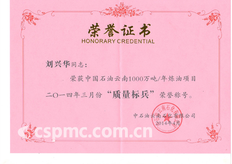 熱烈祝賀劉興華同志榮獲中國石油云南1000萬噸/年煉油項目2014年3月份“質量標兵”榮譽稱號!
