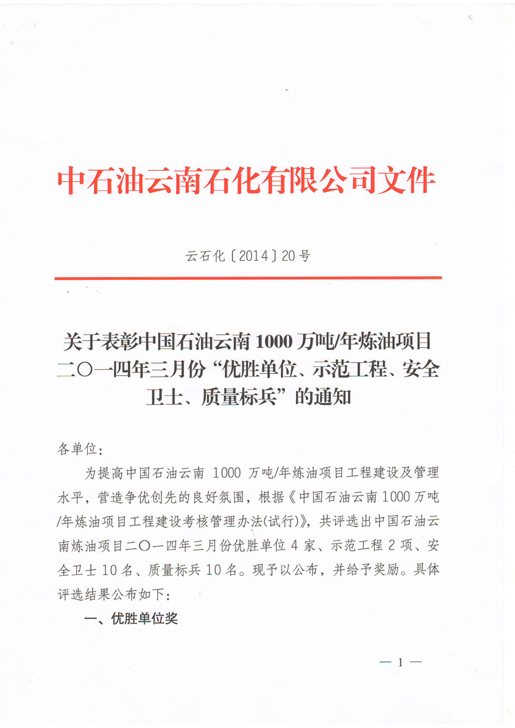我公司榮獲中國石油云南1000萬噸/年煉油項目2014年3月份“優勝單位”稱號